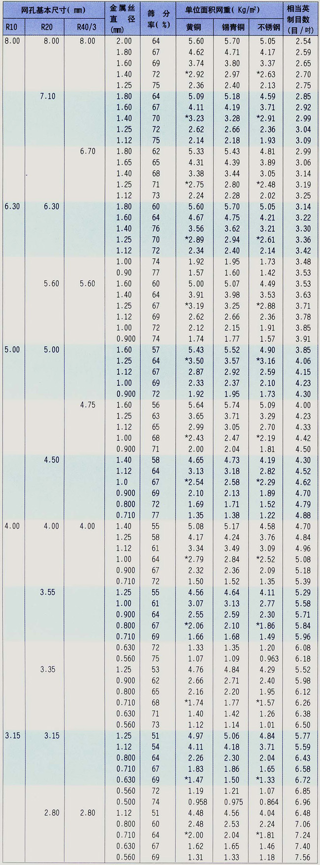 規格表中方孔網與磨料行業標準分級篩網各項技術參數通用,表中所列為常用規格(部分)。